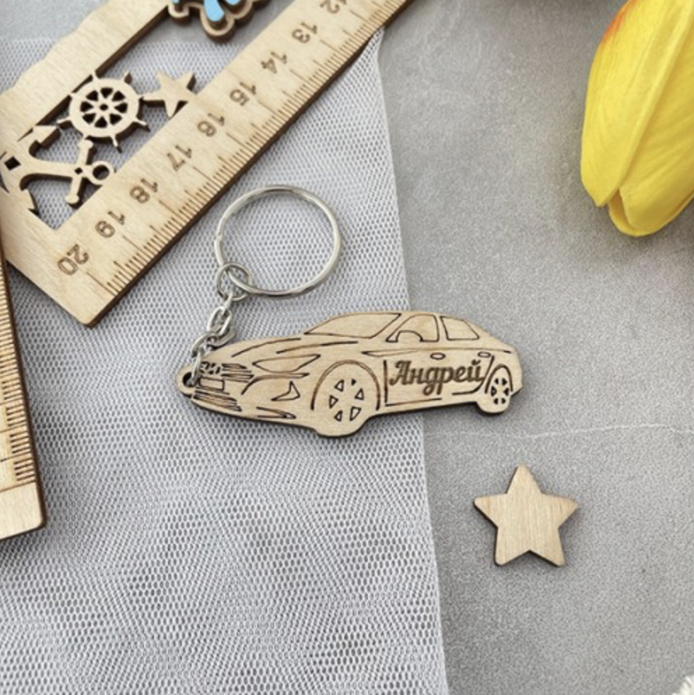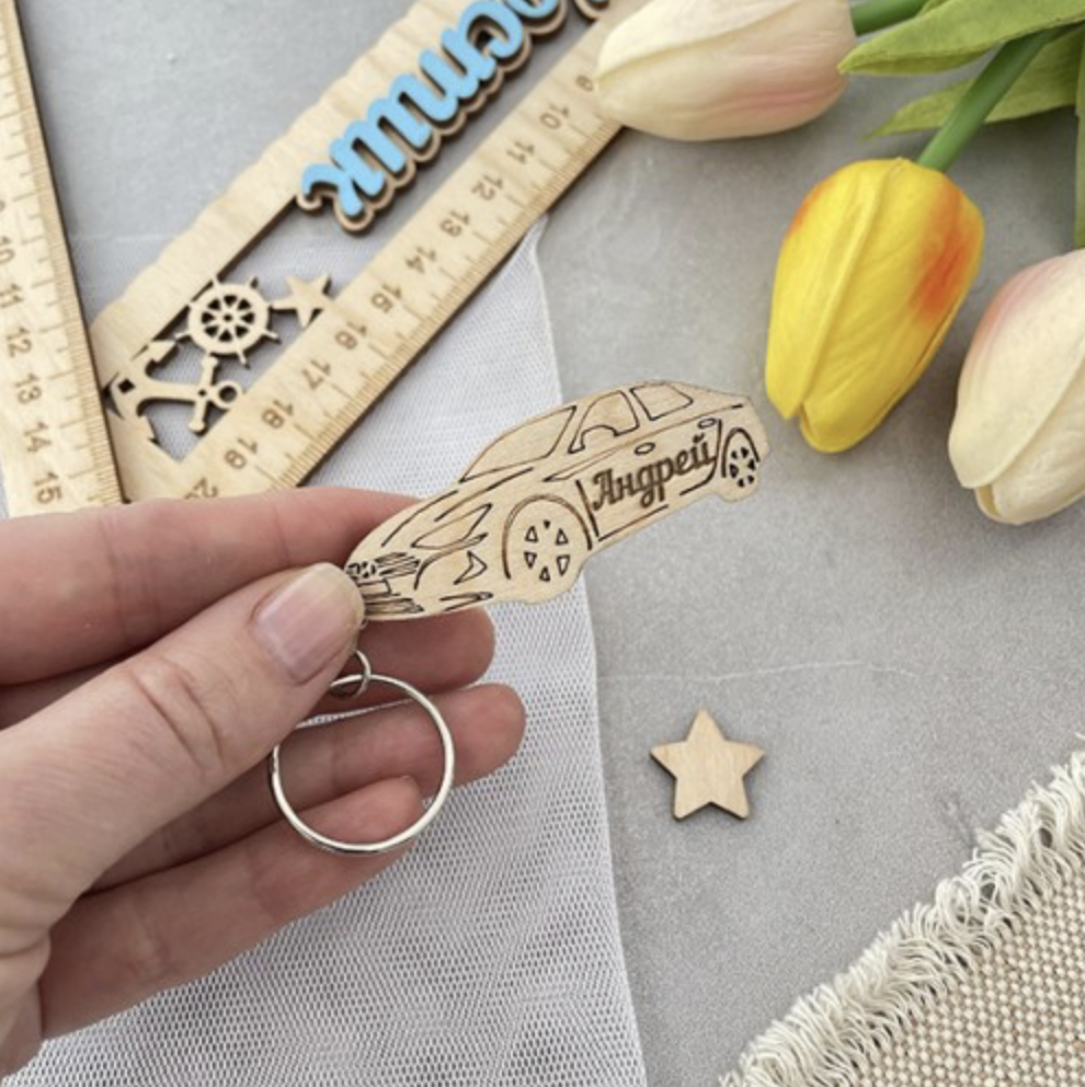Брелок в виде автомобиля с именем на заказ — стильный аксессуар и отличный подарок для автолюбителей. Изготавливается из натурального дерева с прочной фурнитурой, украшен гравировкой имени, номера или любой другой надписи. Такой брелок подчеркнёт индивидуальность владельца, станет полезным дополнением к ключам от машины или рюкзака. Оригинальный сувенир для друзей, коллег, близких или в качестве корпоративного подарка.