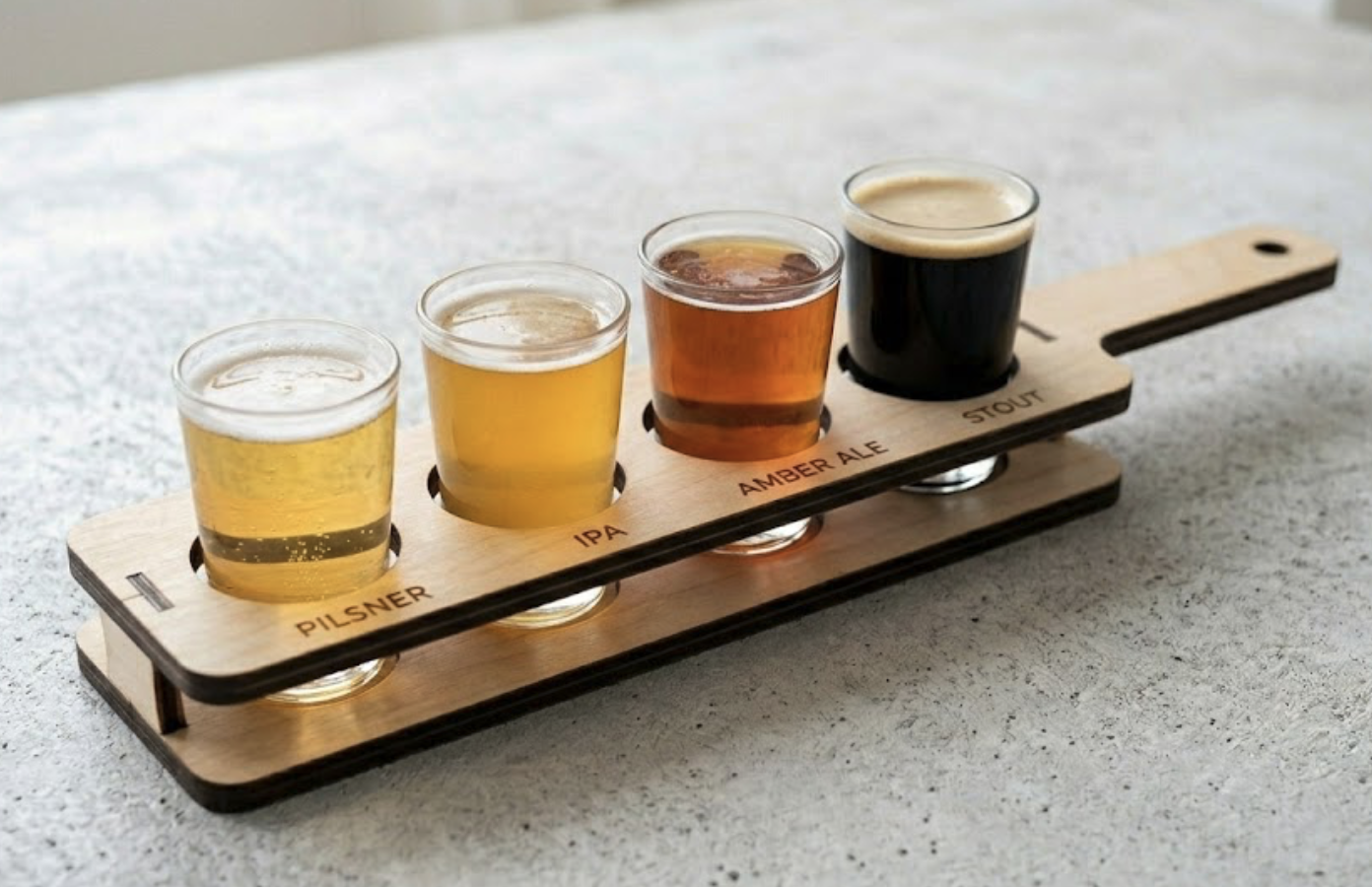 Доска дегустационная для пива (flight) на 4 Изделие для сервировки и подачи в HoReCa. Размер, форма и покрытие — на заказ. Гравировка логотипа возможна.