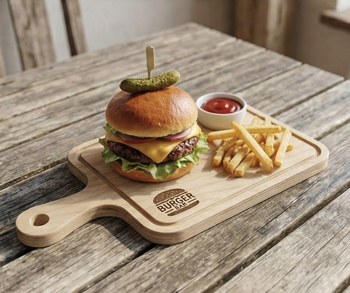 Доска для подачи бургеров (с ручкой) Изделие для сервировки и подачи в HoReCa. Размер, форма и покрытие — на заказ. Гравировка логотипа возможна.