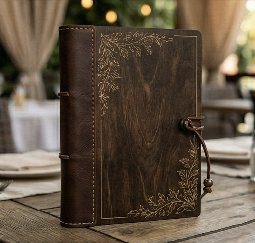 Обложка меню с кожаным корешком (премиум) Обложка/меню из дерева для HoReCa. Изготовим под формат A4/A5, на кольцах/винтах/прижиме. Гравировка логотипа и покрытие по запросу.