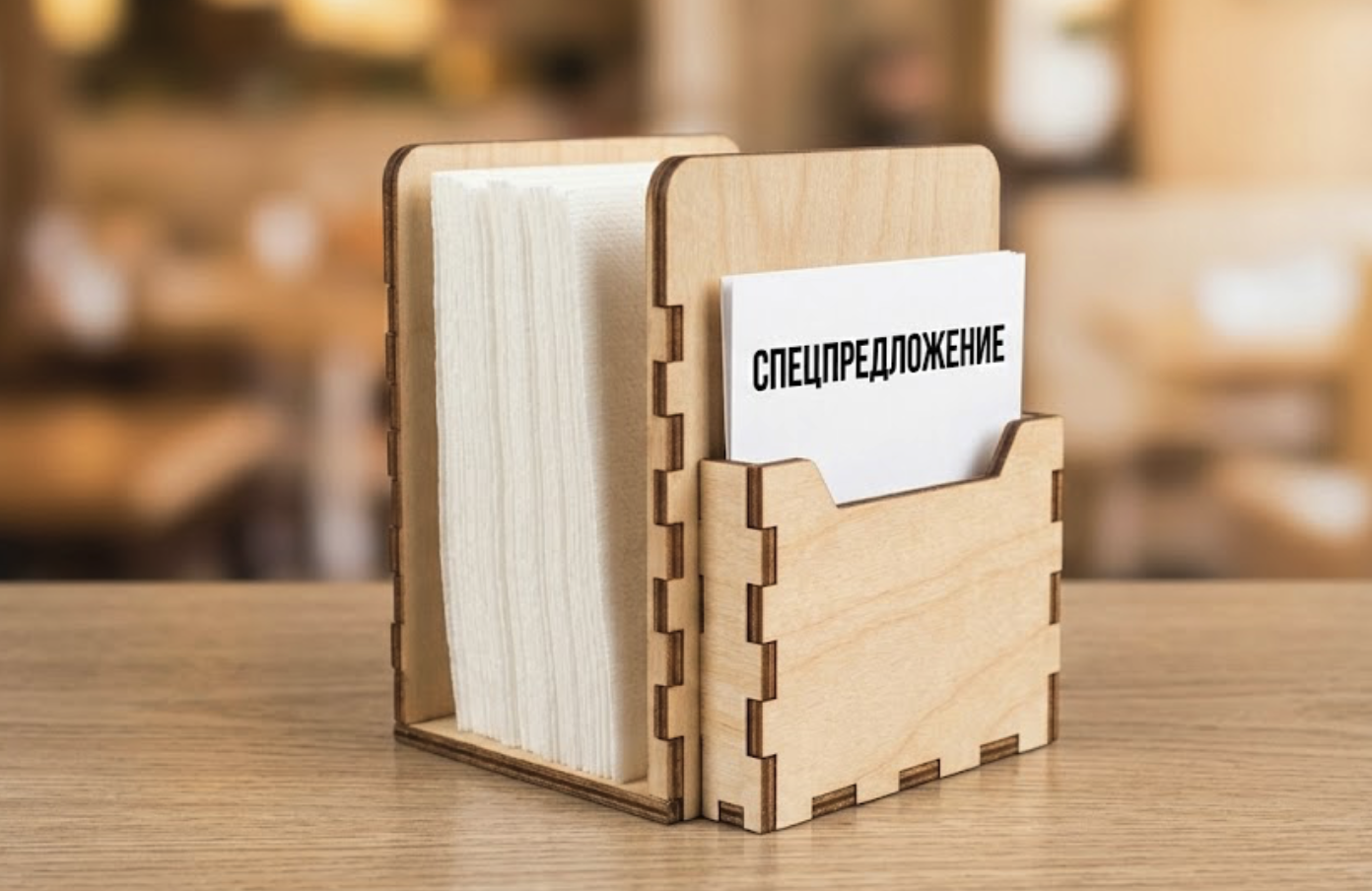 Салфетница с карманом под рекламу/акцию Салфетница из дерева для HoReCa. Делаем любые размеры, форму и гравировку. Покрытие под интерьер заведения.