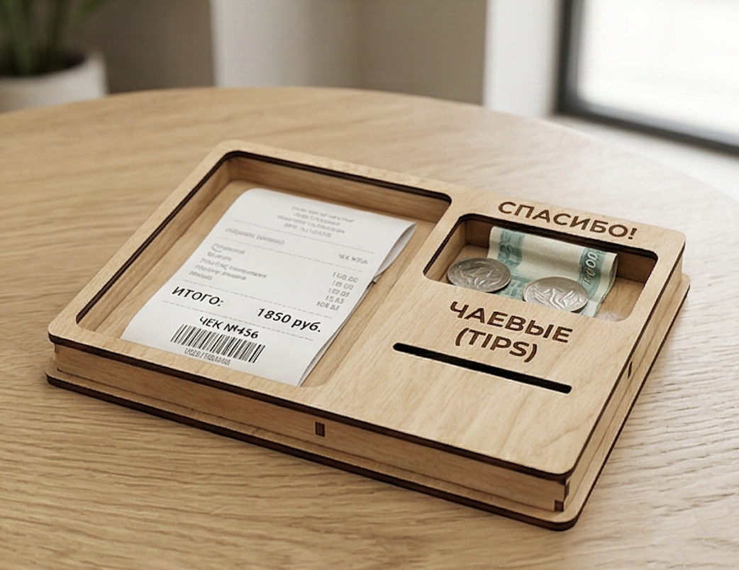 Счетница для чаевых (отдельное отделение) Счетница из дерева для подачи счета. Возможна гравировка логотипа и текста. Размер и покрытие — на заказ.