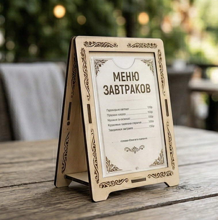 Тейбл‑тент с карманом под вставку (акрил) Тейбл‑тент со вставкой под сменную информацию. Подходит для акций и десертов. Размер по запросу.