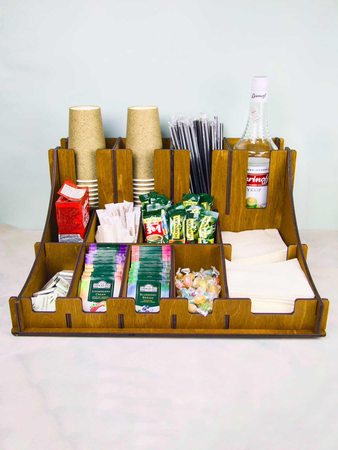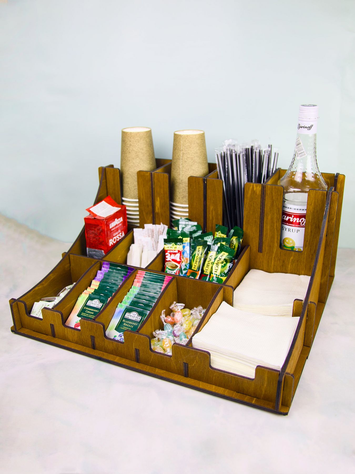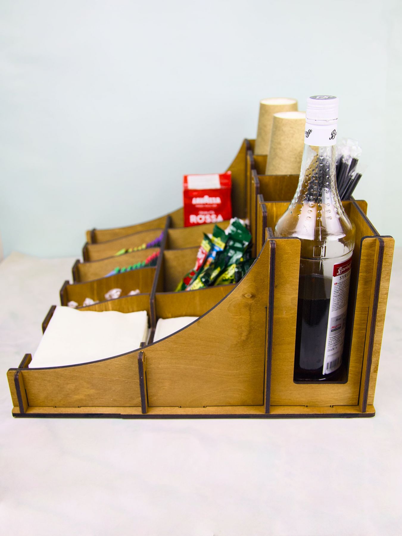 Органайзер для стаканчиков огромный коричневый на заказ по индивидуальным размерам и дизайну. Возможно тонирование любым цветом, гравировка, любая форма и размер - всё в соответствии с вашими пожеланиями. Индивидуально рассчитываются слишком большие или нестандартно маленькие размеры органайзеров из дерева.