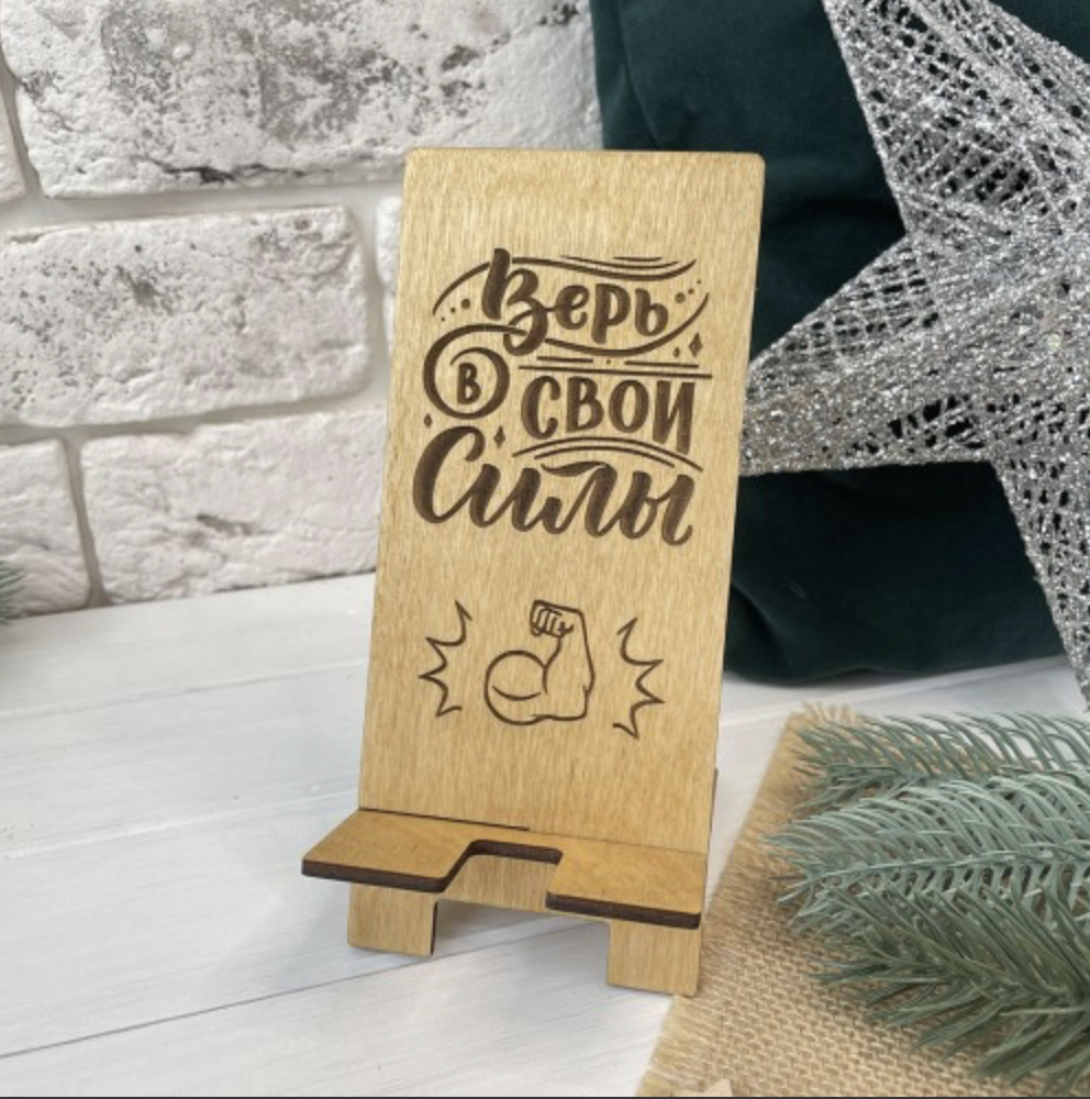 Подставка под телефон из фанеры "Верь в свои силы" — это не просто удобный аксессуар, а ещё и ежедневное напоминание о том, что всё возможно. Лёгкая и прочная подставка удерживает смартфон под удобным углом, освобождает руки и помогает организовать рабочее место.