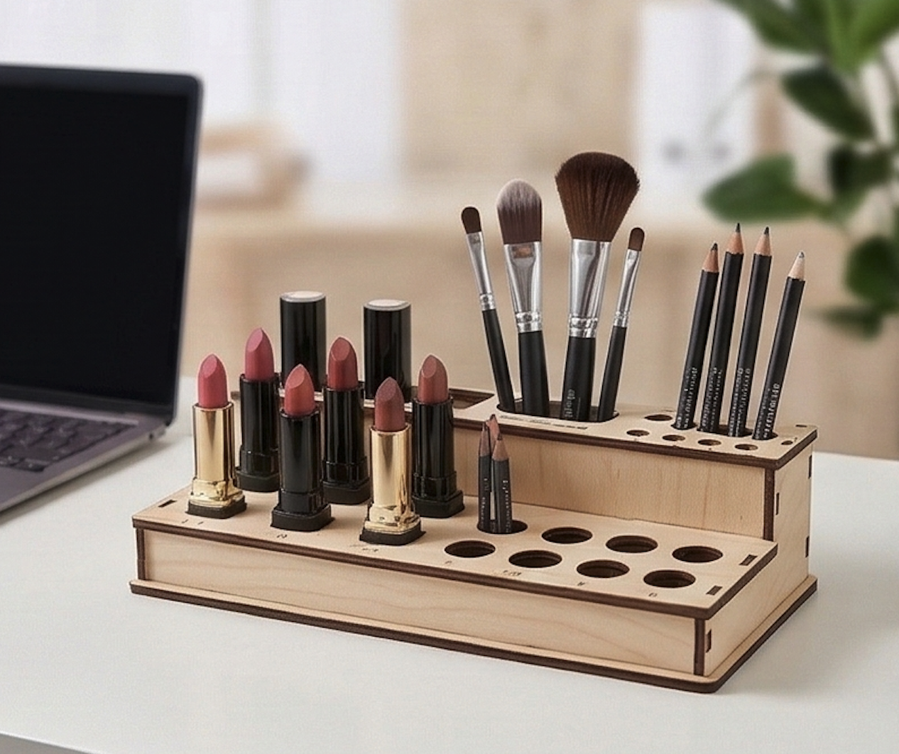 Деревянный стенд-органайзер для косметики: помады, кисточки, карандаши.