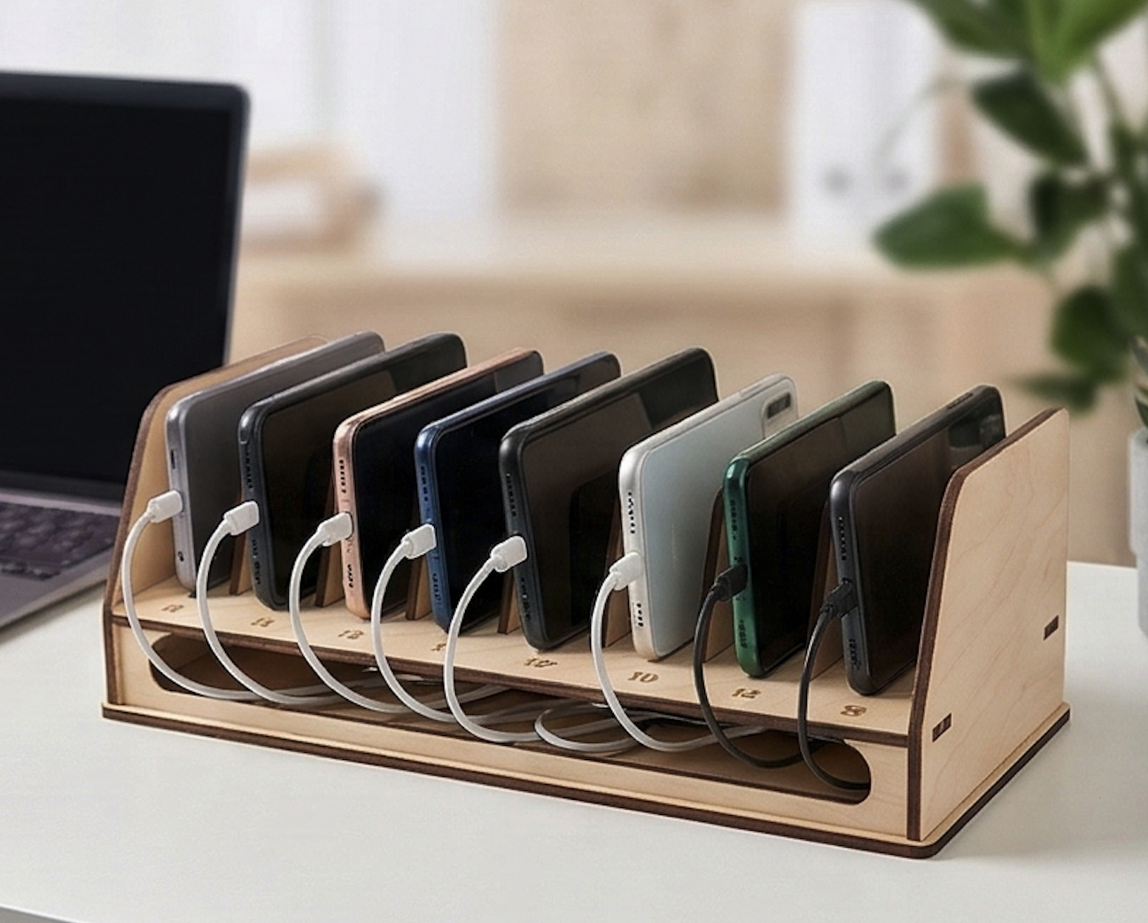 Стенд для телефонов на 10 мест — для офиса, школы, коворкинга или мероприятий.