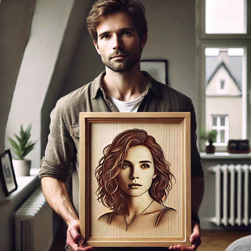 Выжженный портрет — это изображение человека, перенесённое на деревянную поверхность с помощью лазерной гравировки. В отличие от печати, краска не наносится сверху, а рисунок формируется за счёт изменения структуры древесины.